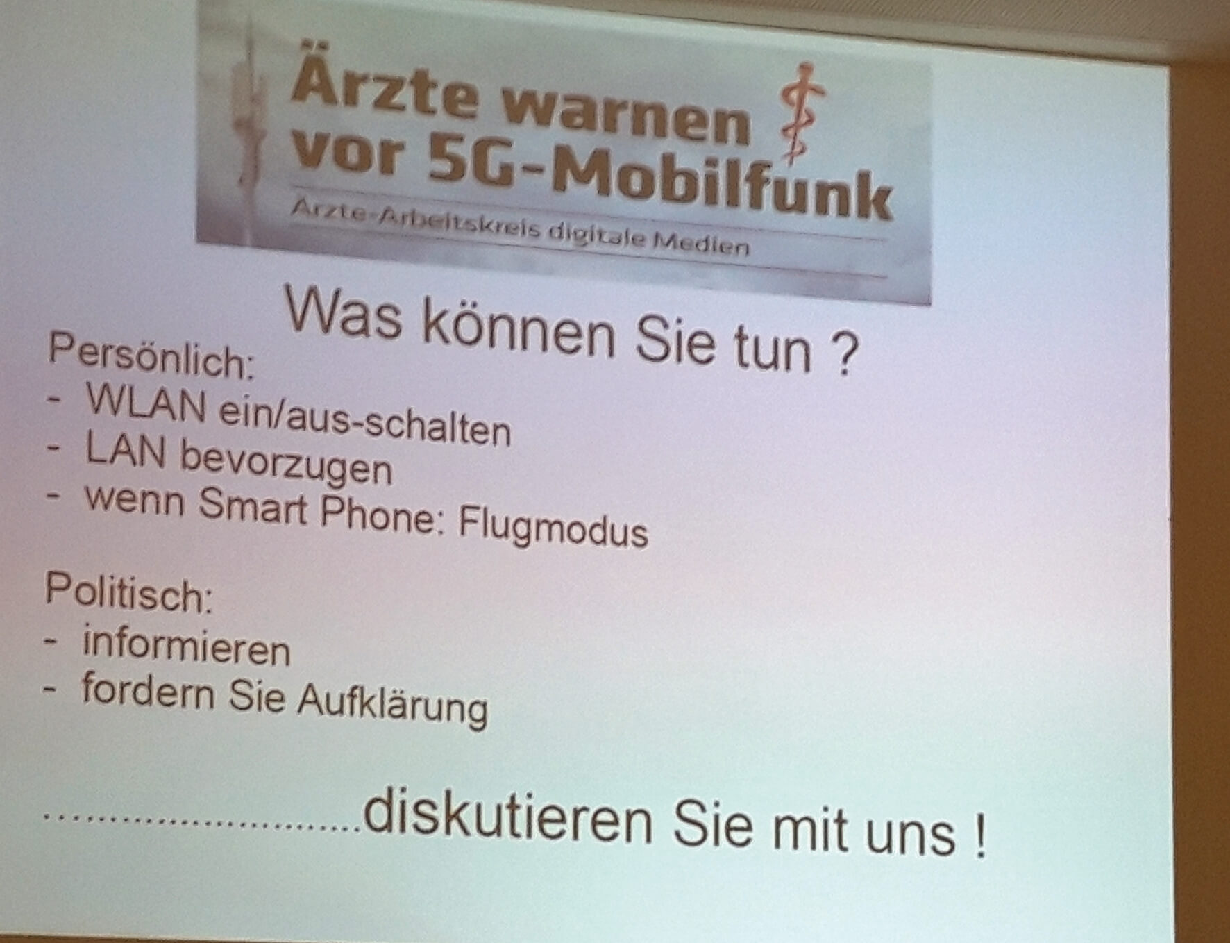 Das zweite Generalthema des Abends gestaltete Dr. med. Jörg Schmid, Mitglied im Ärztearbeitskreis „Digitale Medien“ Stuttgart. Er beleuchtete, wie Digitalisierung die Beziehungen, Bindung, Emotionalität und das Verhalten verändert. Er veranschaulichte, wie Mobilfunk auf technisch erzeugter, gepulster Mikrowellenstrahlung in Frequenzbereiche eindringt, die bisher von der Natur den Zellvorgängen vorbehalten waren! Dies erzeugt athermische Wirkungen, die Krebs auslösen (Gehirntumore), Zeugungsunfähigkeit und Elektro-Hypersensibilität (EHS) fördern und den oxydativen Zellstress erzeugen. EHS-Symptome sind Kopfschmerzen, Konzentrations- und Schlafprobleme, Depression, Energiemangel, Erschöpfung und grippale Symptome.